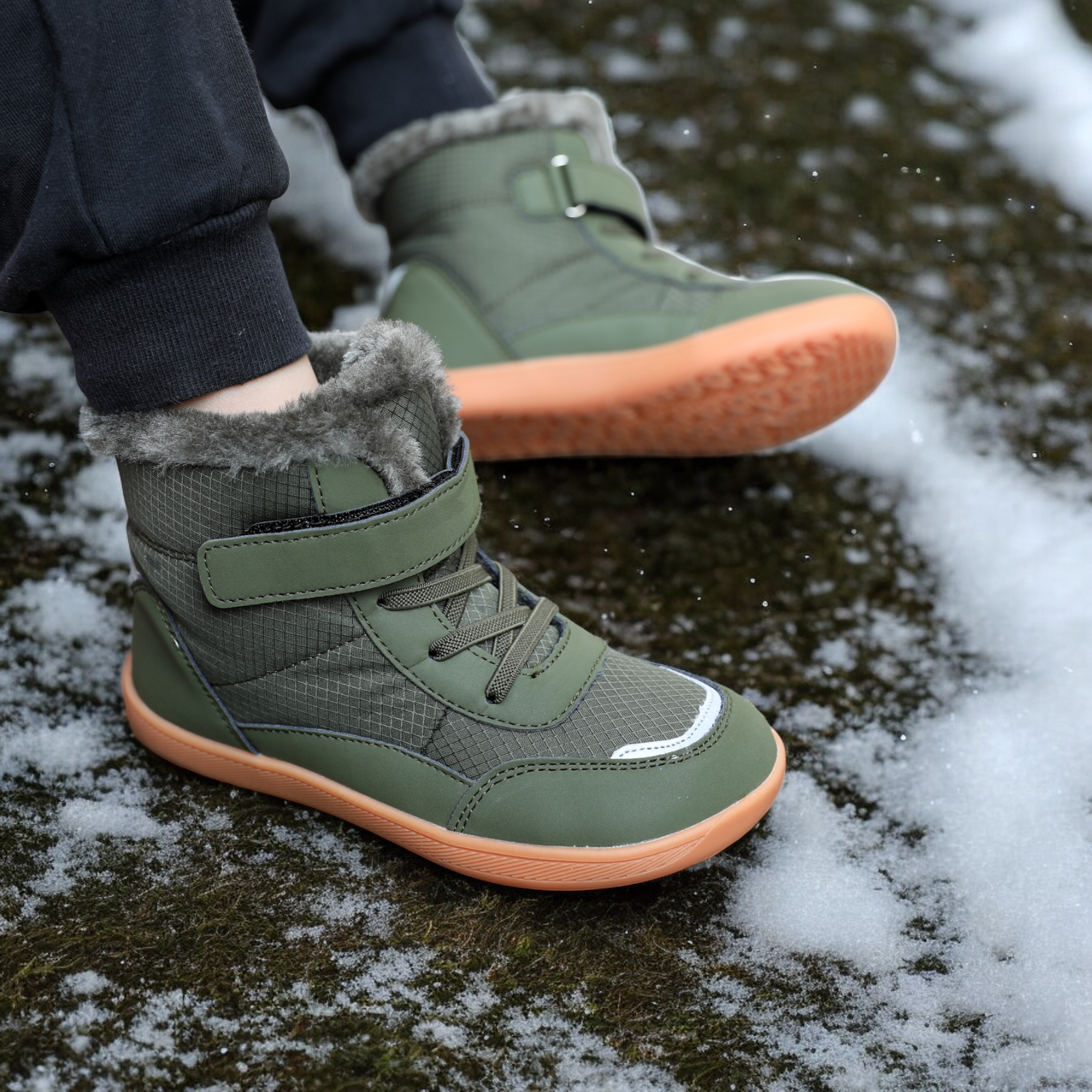The water resiatant construction keeps little feet dry in snow and rain, while the flexible, lightweight sole supports natural movement. With a wide toe box for comfort and space to grow, kids can enjoy better balance, posture, and foot strength even in cold conditions.