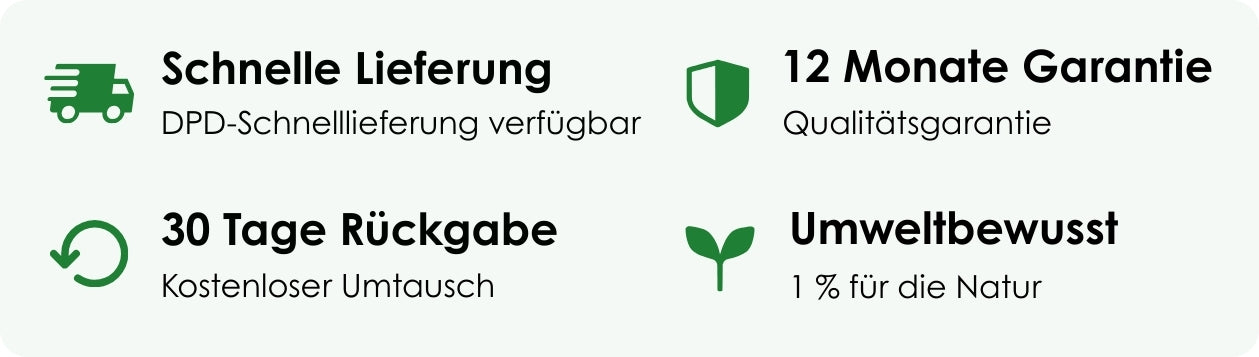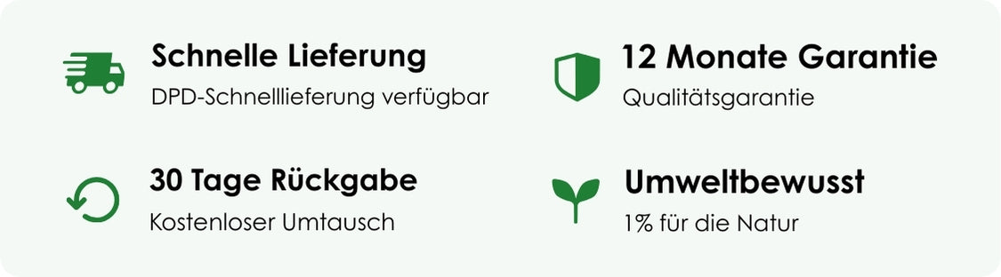 Bestellungen aus dem Vereinigten Königreich werden mit DPD Next Day Delivery (1 Werktag) versendet, wenn sie in unserem britischen Lager vorrätig sind, ansonsten 5-8 Tage. In Deutschland und Europa beträgt die Lieferzeit 2-3 Tage, wenn die Produkte sofort verfügbar sind, oder andernfalls 6-9 Tage. Bestellungen aus den USA und weltweit kommen in 4-7 Tagen an, wenn sie sofort verfügbar sind, oder ansonsten in 8-12 Tagen. Die Lieferzeiten werden beim Checkout angezeigt. Die Bearbeitungszeit beträgt 0-3 Tage, abhängig von den Produkten und der Jahreszeit. Rücksendungen werden innerhalb von 30 Tage an unsere Lager im Vereinigten Königreich oder in Deutschland akzeptiert. Kostenlose Umtausche verfügbar.