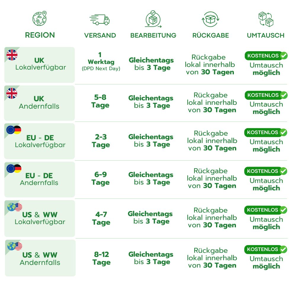 Bestellungen aus dem Vereinigten Königreich werden mit DPD Next Day Delivery (1 Werktag) versendet, wenn sie in unserem britischen Lager vorrätig sind, ansonsten 5-8 Tage. In Deutschland und Europa beträgt die Lieferzeit 2-3 Tage, wenn die Produkte sofort verfügbar sind, oder andernfalls 6-9 Tage. Bestellungen aus den USA und weltweit kommen in 4-7 Tagen an, wenn sie sofort verfügbar sind, oder ansonsten in 8-12 Tagen. Die Lieferzeiten werden beim Checkout angezeigt. Die Bearbeitungszeit beträgt 0-3 Tage, abhängig von den Produkten und der Jahreszeit. Rücksendungen werden innerhalb von 30 Tage an unsere Lager im Vereinigten Königreich oder in Deutschland akzeptiert. Kostenlose Umtausche verfügbar.