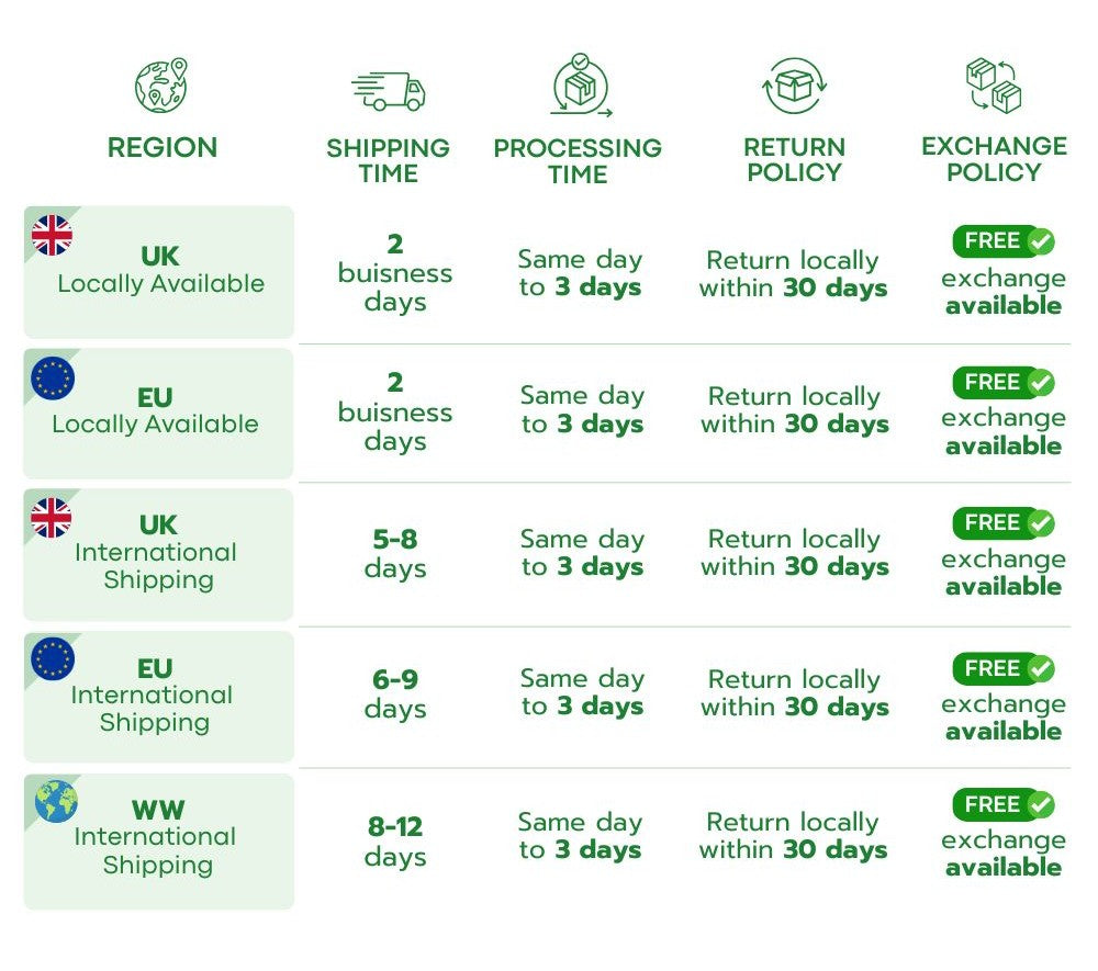 Le délai d'expédition est de 2 jours ouvrables si les produits sont immédiatement disponibles dans notre entrepôt au Royaume-Uni (pour les clients basés au Royaume-Uni) ou dans notre entrepôt basé aux Pays-Bas (pour les clients de l'UE), sinon le délai d'expédition est de 5 à 8 jours pour les clients basés au Royaume-Uni, de 6 à 9 jours pour les clients basés dans l'UE et de 8 à 12 jours pour les clients basés aux États-Unis. Le délai de traitement est du même jour à 3 jours, en fonction des produits et de la période. Retournez localement (au Royaume-Uni ou dans les entrepôts des Pays-Bas) dans les 30 jours. Échange gratuit disponible.
