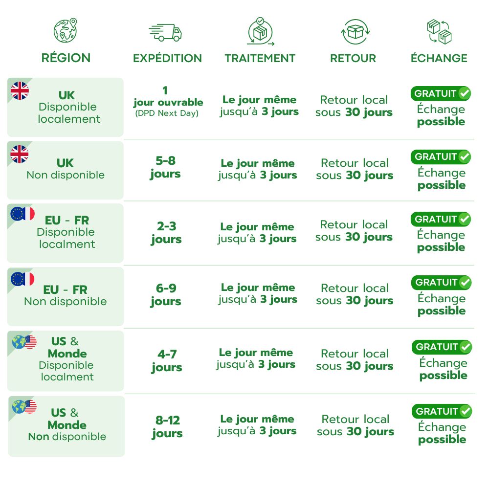 Les commandes au Royaume-Uni sont expédiées avec DPD Next Day Delivery (1 jour ouvrable) si elles sont en stock dans notre entrepôt au Royaume-Uni, sinon 5-8 jours. En Allemagne et en Europe, la livraison prend 2-3 jours si les produits sont immédiatement disponibles ou 6-9 jours sinon. Les commandes aux États-Unis et dans le monde entier arrivent en 4-7 jours si elles sont immédiatement disponibles ou en 8-12 jours sinon. Les délais de livraison sont indiqués lors du paiement. Le délai de traitement est de 0-3 jours, selon les produits et la période de l’année. Les retours sont acceptés dans un délai de 30 jours vers nos entrepôts du Royaume-Uni ou d’Allemagne. Échanges gratuits disponibles.