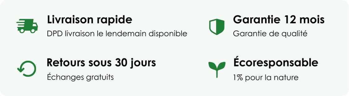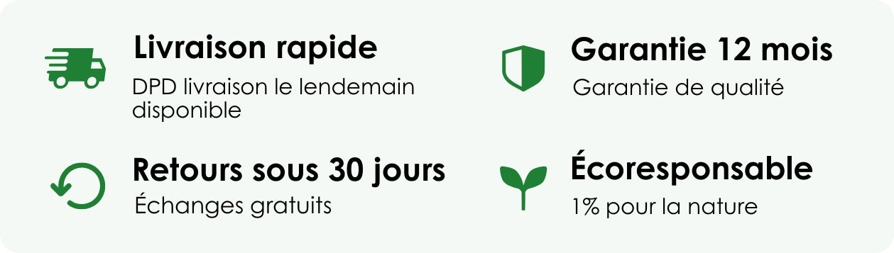 Naturcontact est une entreprise basée au Royaume-Uni, dédiée à la sélection de produits de haute qualité répondant aux besoins de nos clients. Nous mettons un soin particulier à choisir des matériaux et des partenaires qui partagent nos valeurs de confort, de performance et de durabilité. Confiants dans la solidité et la qualité de fabrication de nos produits, nous offrons fièrement une garantie de 12 mois pour garantir votre entière satisfaction.